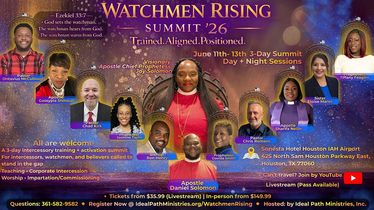 Watchmen Rising Summit ’26 is a 3-day gathering designed for intercessors, watchmen, and believers who are hungry for the presence of God and ready to live with clear purpose. This summit is more than a conference—it’s a space to be refreshed, trained, and aligned so you can return home strengthened and positioned to stand in the gap.