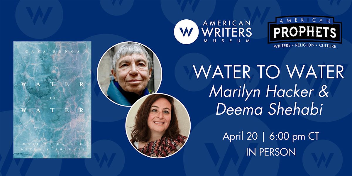 Award-winning poets Marilyn Hacker and Deema K. Shehabi visit the American Writers Museum to read from their powerful new book Water to Water: Gaza Renga, a poetry collaboration in the call-and-response form of Renga during the conflict in Gaza. The pair will have a conversation on their writing journey and share how the collaboration came to be. Books will be available for purchase and the poets will sign them following the program.