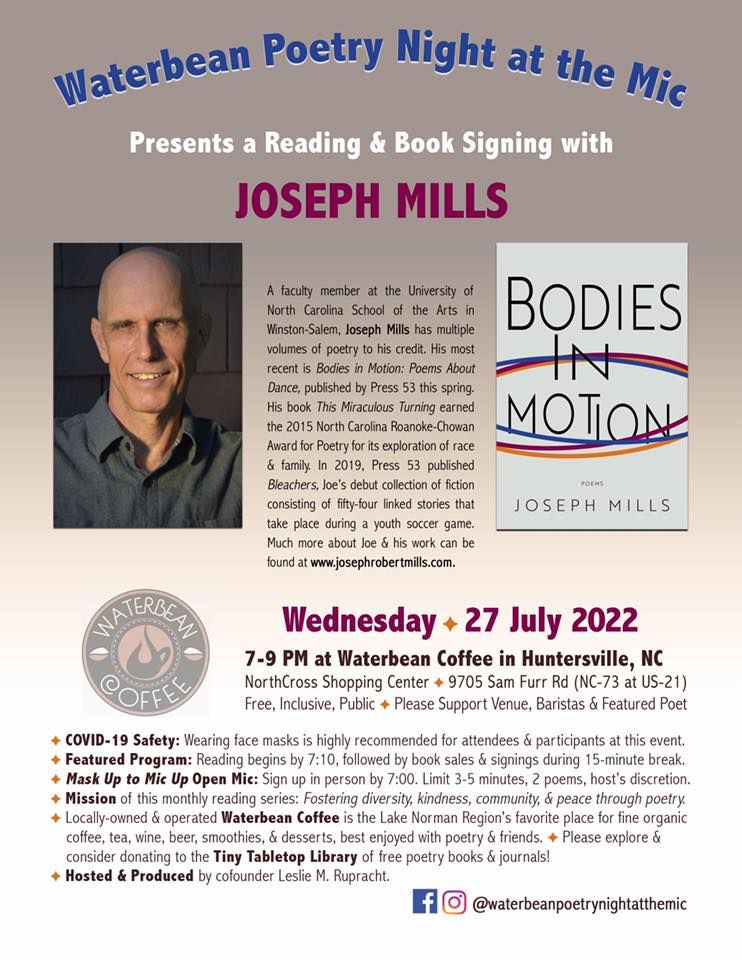 Hello, Poets & Friends! Please join me at Waterbean Poetry Night on Wednesday, JULY 27th when I'll present a reading & book signing by this month’s Featured Poet: JOSEPH MILLS.
