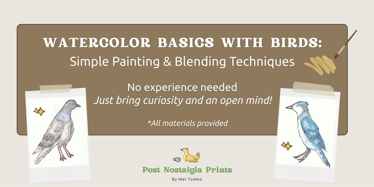 Mei Tomko of Post Nostalgia Prints will guide attendees through a relaxed 2-hour workshop exploring simple watercolor painting and blending techniques: wet on dry and wet on wet. We will use these techniques to paint two pre-drawn bird doodles done by Mei that you will take home. Mei will demonstrate both technique and provide individualized support to each attendee.