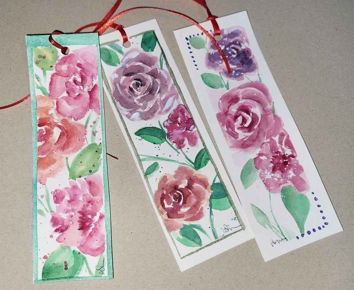 Grab your sweetie (or bestie, or mom, or anyone you love to get crafty with) and learn how to create loose floral images with watercolor. We will learn how to turn water, color and brushstrokes into FOUR bookmarks. Materials, ribbons, practice paper all included