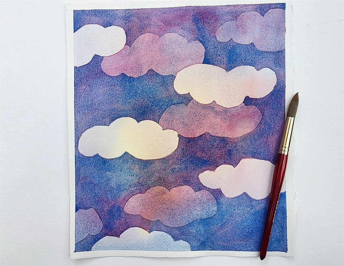 Learn to create a unique watercolor effect through “negative-style” painting using cloud stencils. The class will emphasize watercolor concepts including mixing colors and building value. No previous watercolor painting experience required. Your completed painting will be ready for framing!