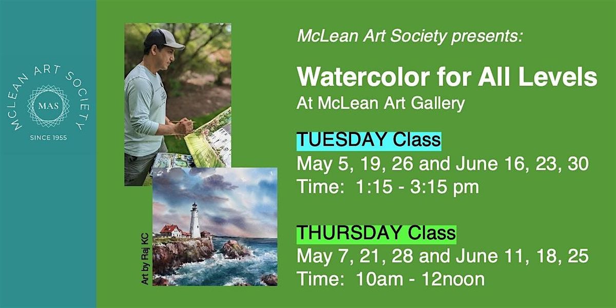 6 classes. Learn to capture the transparent quality of watercolor, including still life and landscapes. Individualized instruction accommodates students from beginners to the very experienced. Supply list provided to registered students. Classes are held at the McLean Art Gallery at the Chesterbrook Shopping Center (plenty of free parking).