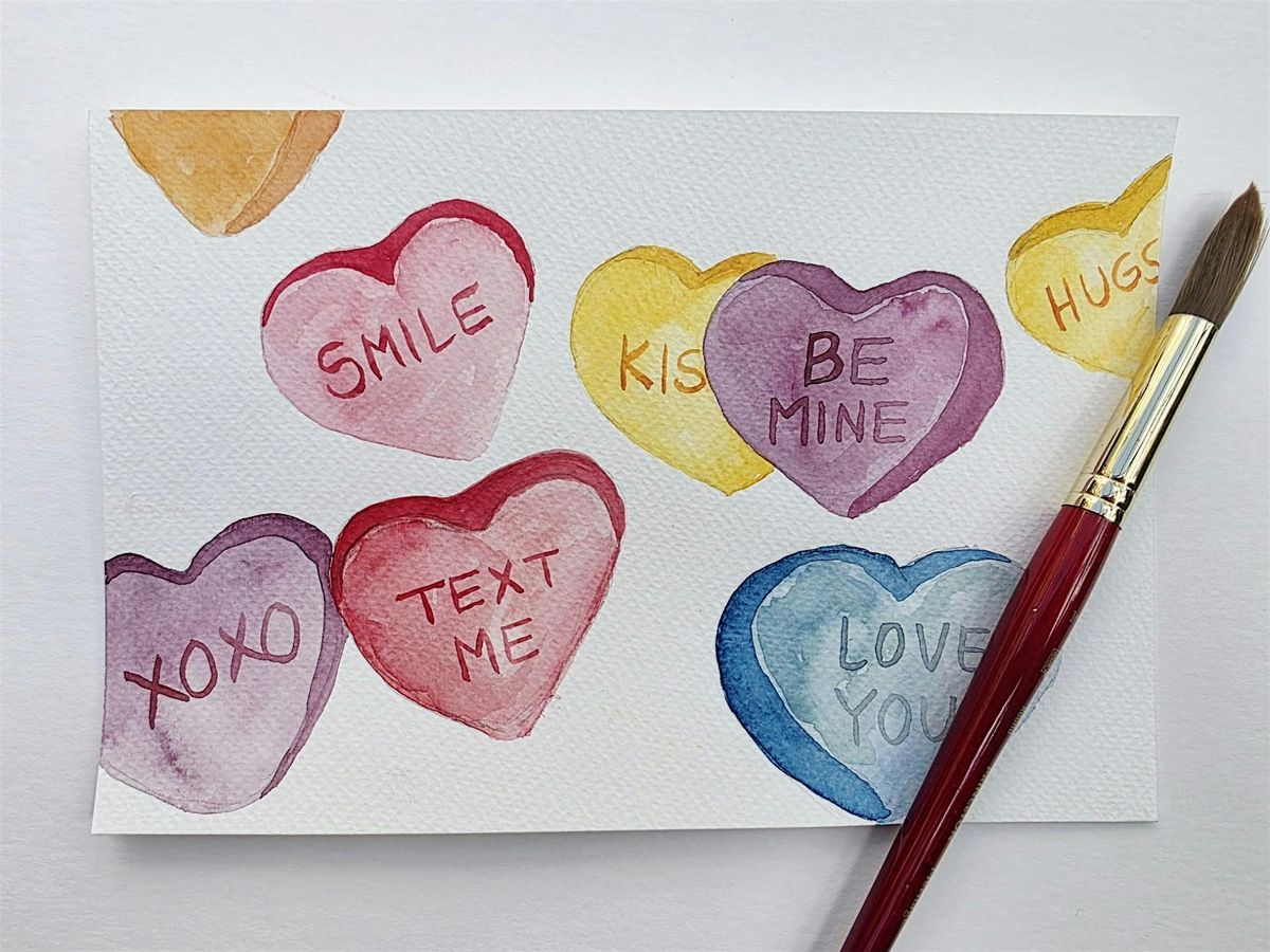 Celebrate Valentine’s Day by learning to paint playful conversation hearts. The class will emphasize watercolor concepts including mixing colors and building value. No previous watercolor painting experience required. All supplies are included in your session fee. Your completed painting will be ready for framing!