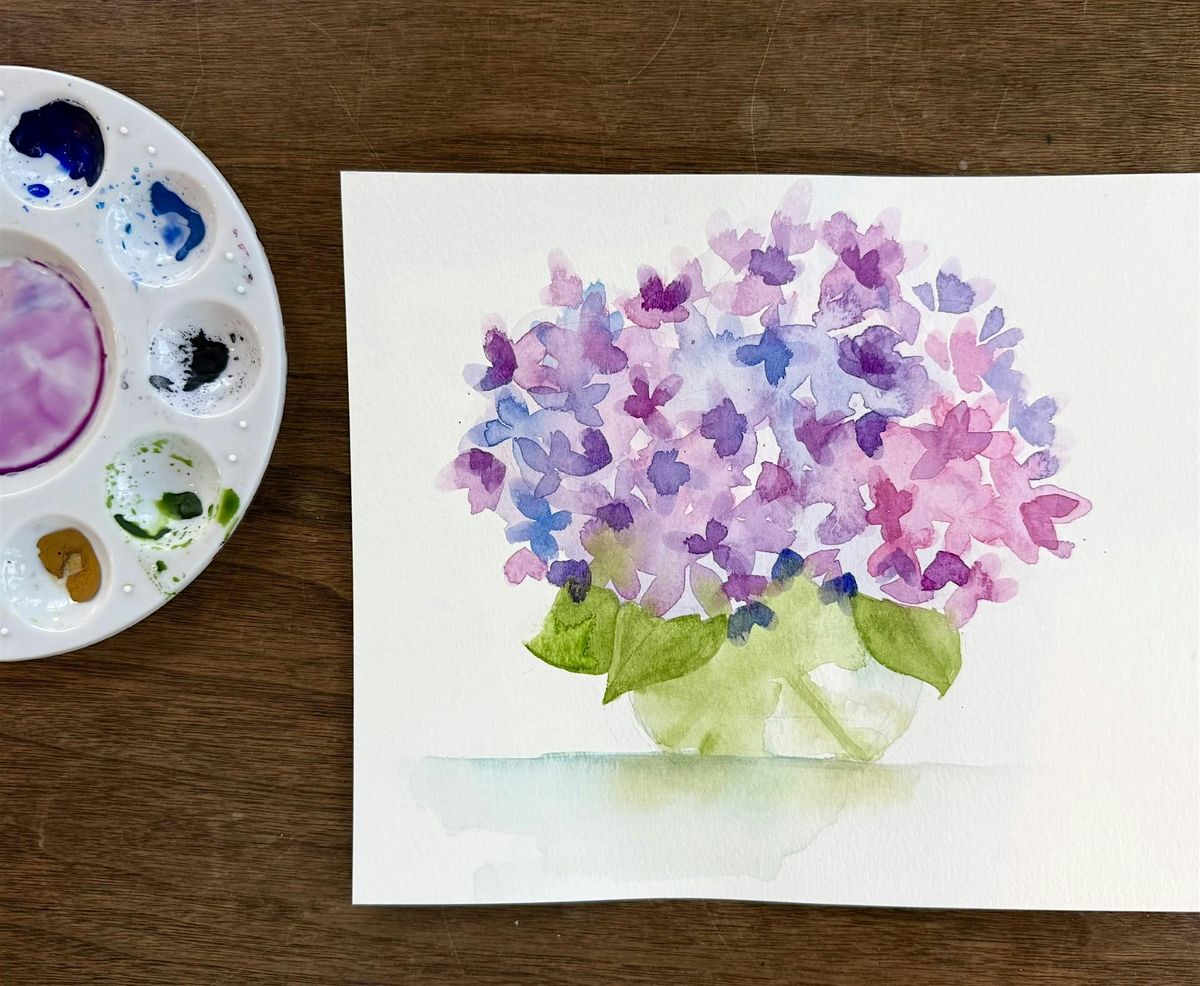 Class Description: Let your creativity bloom! Local artist Natalie Brooks will guide you step by step through painting a vase full of hydrangeas. We’ll practice layering, color-mixing, and softening edges. Whether you’re new to watercolor or already have experience, you’ll learn new techniques, have fun, and go home with a lovely watercolor painting!