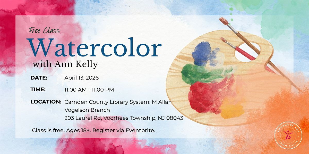 Join the Voorhees Art Commission for a free watercolor class led by artist Ann Kelly. This session offers a relaxed, welcoming environment to explore watercolor techniques and create your own artwork.