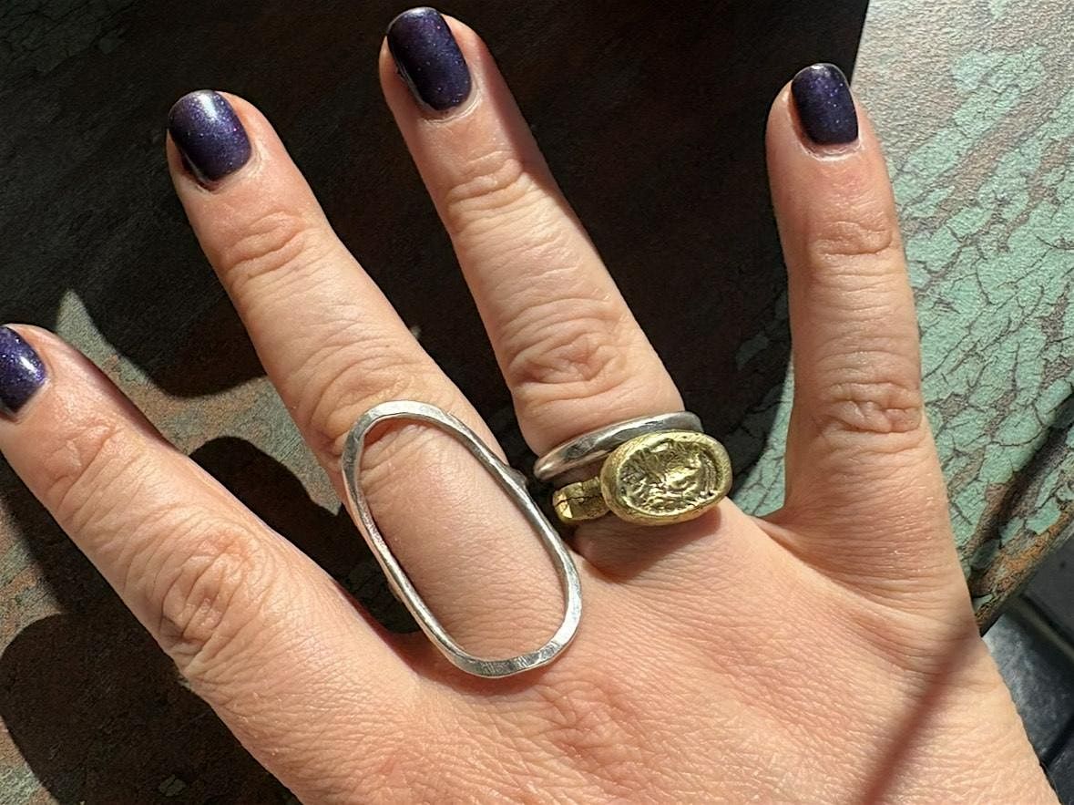 VERY IMPORTANT! Due to the high cost of silver from the metals market fluctuation in 2026, if you want to have your ring in sterling silver it is imperative to carve out the majority of the bulk from the backside of the ring to reduce costs, or make a smaller and less heavy ring. If you want to make a huge piece, you must be willing and able to prepay the instructor before she sends them out to the caster.