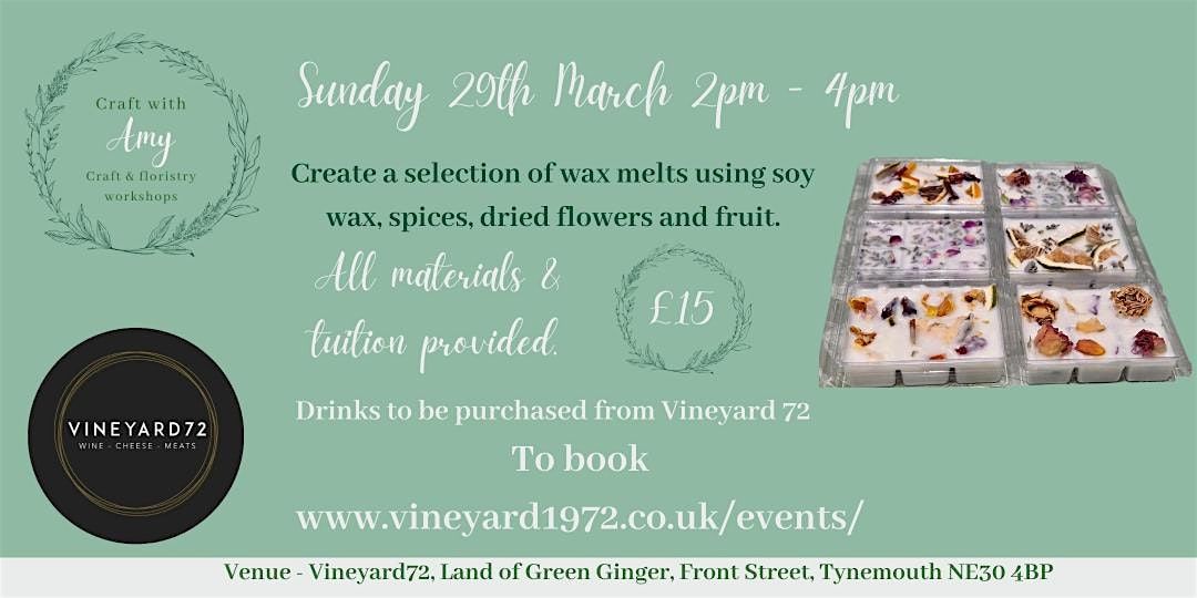Welcome to the Wax Melts Workshop! Join us at Vineyard72 on March 29, 2026 at 2 PM for a fun and creative experience.