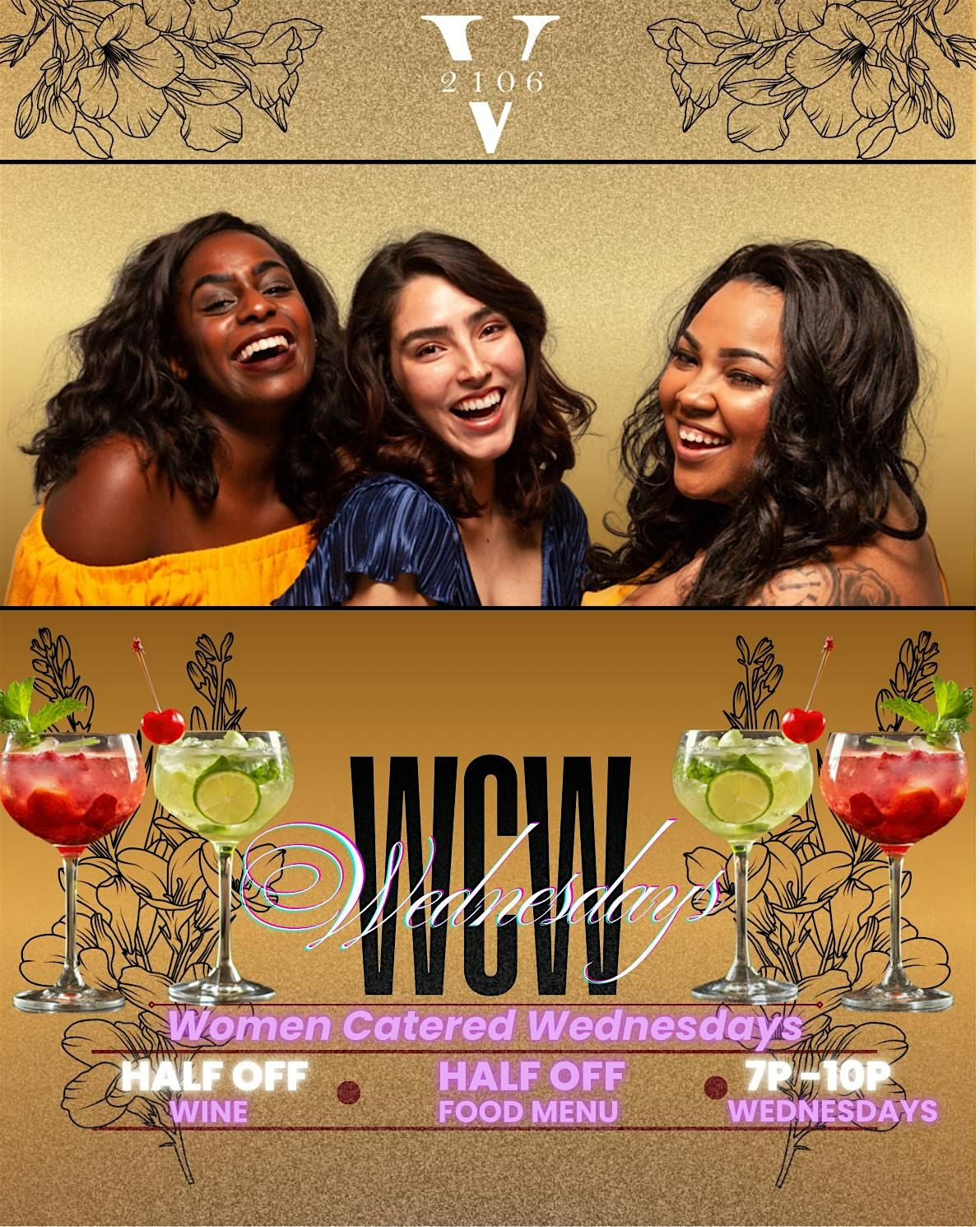 Wednesdays are for the ladies! Join us for WCW Wednesdays, a night dedicated to celebrating women with great vibes, good food, and amazing specials. From 7 PM β 10 PM, ladies can enjoy half off wine and half off select menu items while relaxing, socializing, and unwinding midweek.