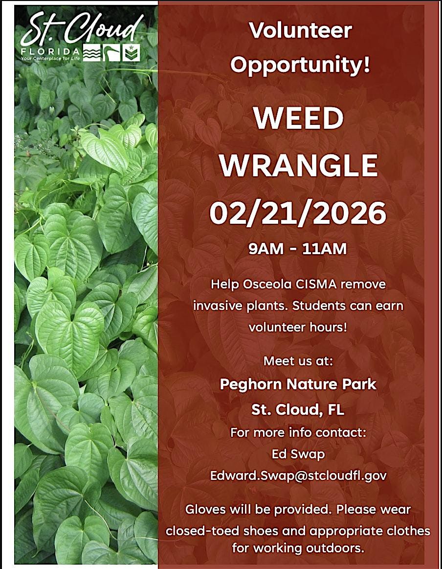 The City of St Cloud, Osceola CISMA, and the Pine Lily Chapter of the FNPS is hosting W**d Wrangle 2026. We will be removing / cutting back assorted non-native invasive plants, particularly Air Potato. The event will run from 9 a.m. to 11 p.m. roughly.