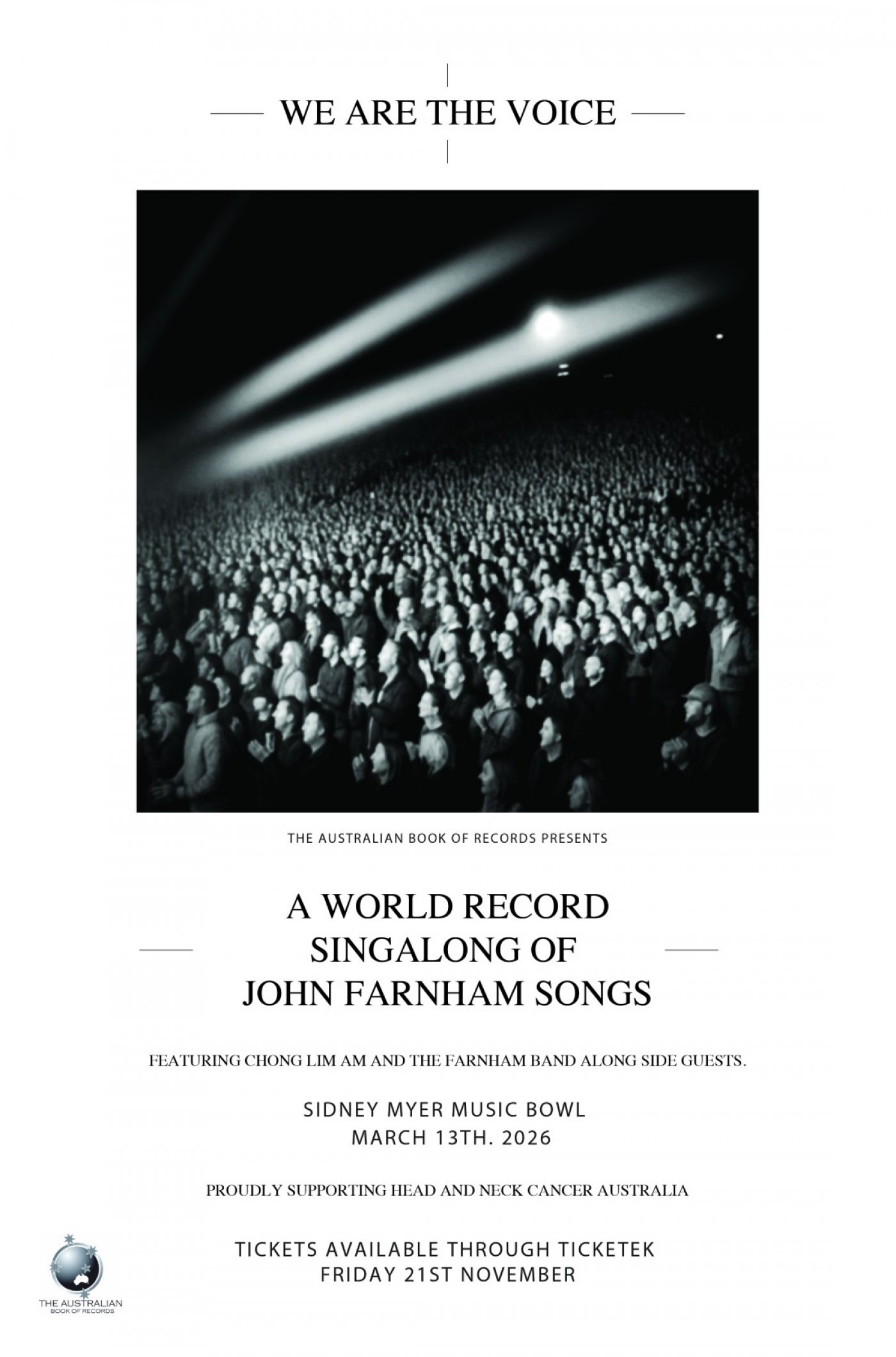 The Australian Book of Records today announces the full performer lineup for We Are The Voice, an unforgettable world record singalong event celebrating the music of John Farnham, set to take place at Sidney Myer Music Bowl on Friday 13 March 2026.