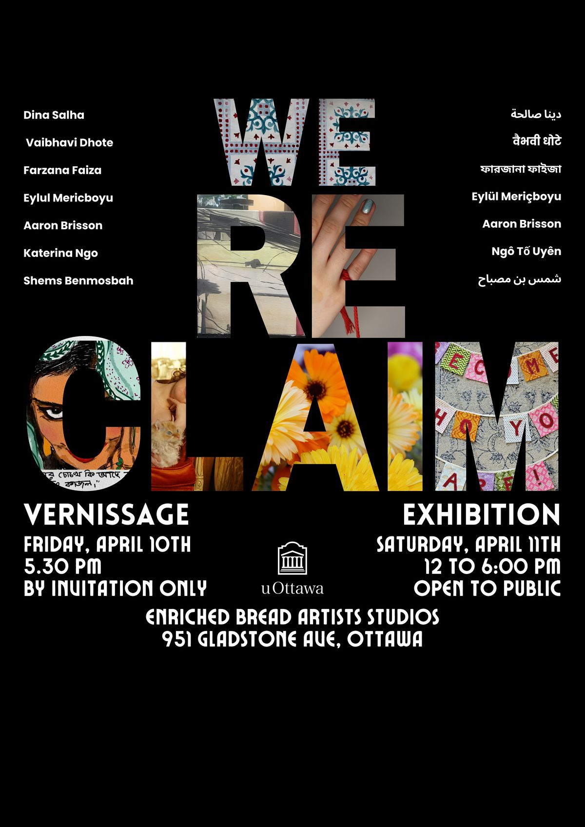 Join us on a private vernissage of the WE RECLAIM Exhibition hosted by the Master's students of the Communication Department of UOttawa of the course Arts, Media and Resistance on 10th of April 2026 at 5.30pm at Enriched Bread Artists Studios.