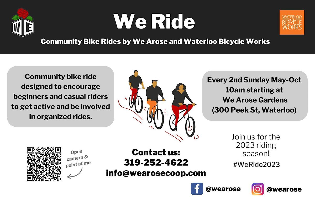The We Ride Series happens on the 2nd Sunday of each month (May through October) and start at 10:00 AM at the We Arose Demonstration Garden located at 300 Peek St in Waterloo.