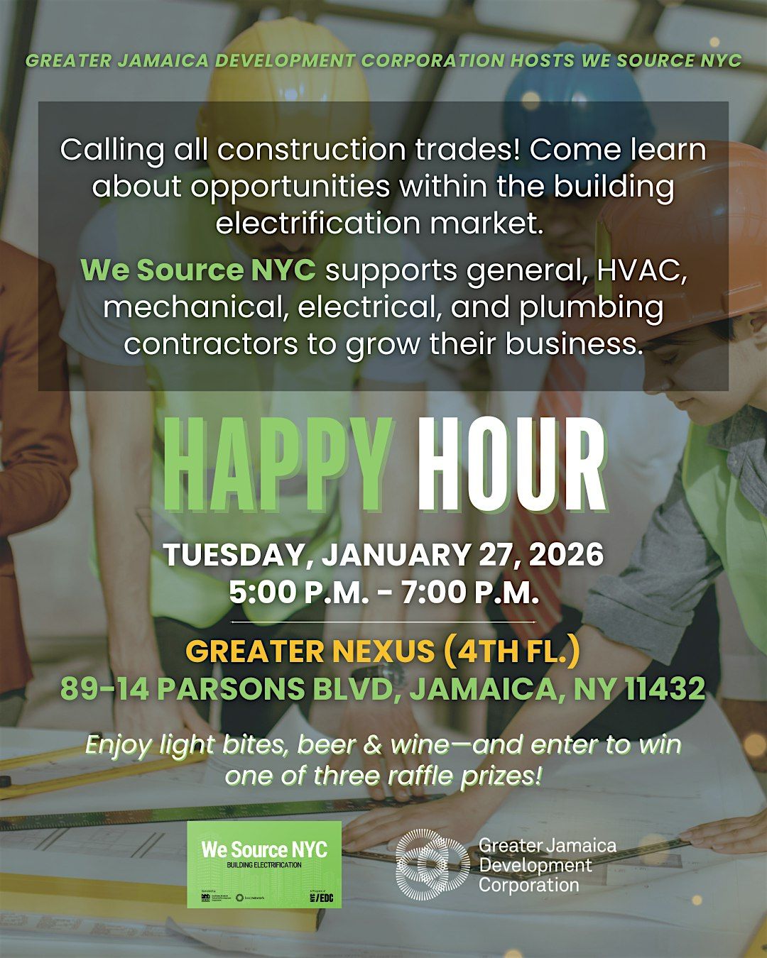 GJDC will be hosting We Source NYC for Happy Hour! Calling all construction trades!Come learn about opportunities within the building electrification market. We Source NYC supports general, HVAC, mechanical, electrical, and plumbing contractors to grow their business. Plus food, drinks and raffled prizes- come join us!