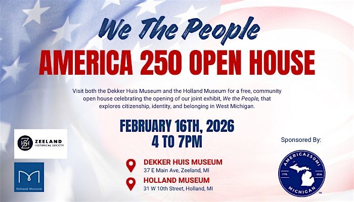 Join us for a special evening celebrating community, history, and belonging at the We the People: America 250 Open House. This free, community-wide event invites you to visit both the Dekker Huis Museum in Zeeland and the Holland Museum for the opening of a new joint exhibition exploring citizenship, identity, and what it means to belong in West Michigan.