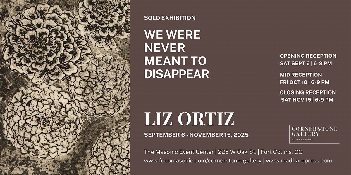 We Were Never Meant to Disappear is a deeply personal solo exhibition by Liz Ortiz, founder of Mad Hare Press. Spanning 21 years of artistic practice, this retrospective features previously unseen works across printmaking, drawing, painting, and photography. Each piece rooted in memory, resilience, and the reclamation of space as an Indigenous Latina woman in Northern Colorado.