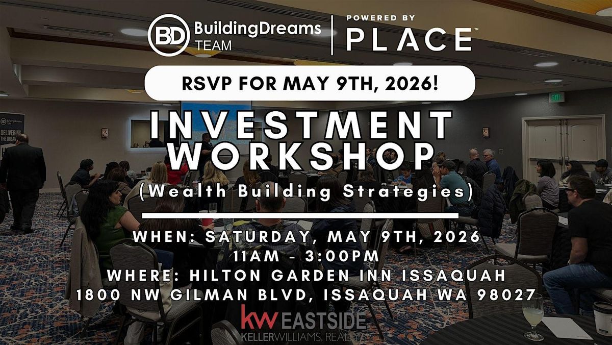 Join us for our upcoming Investment Workshop on Saturday, May 9th, from 11:00 AM – 3:00 PM at the Hilton Garden Inn, Issaquah, WA.