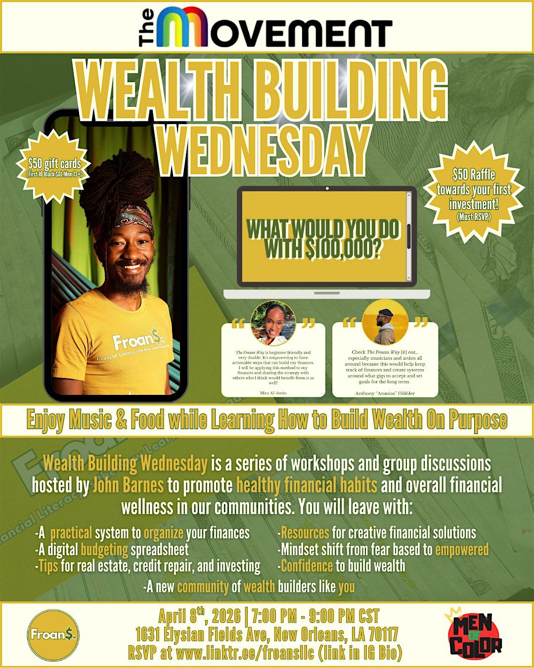 Come vibe to music and enjoy food while you learn practical steps for managing your personal finances and learn about some investing strategies that John Barnes has learned over the course of his wealth building journey, from cumulatively lending out over $100,000 to community members through froans' pilot lending program, to controlling a quarter of a million dollars in assets, and building his networth to over $30,000.