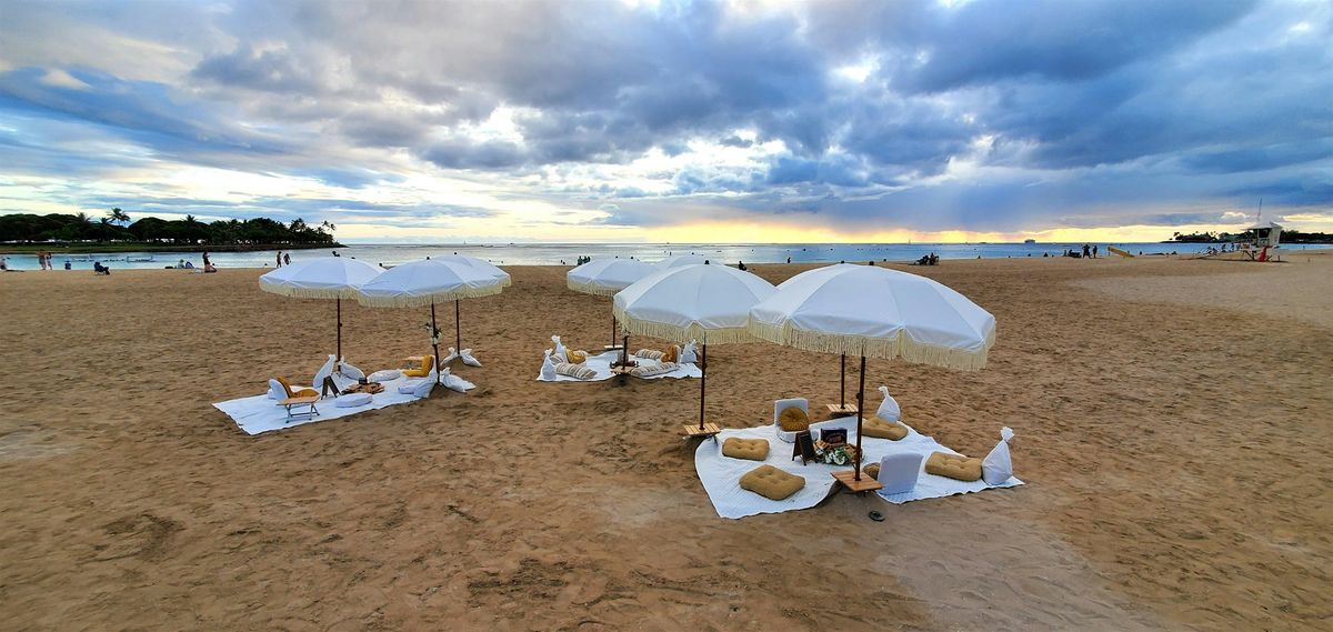 Celebrate your wedding week in paradise with a beautifully curated beach party at Ala Moana Beach! Perfect for welcoming guests, reconnecting with loved ones, or simply soaking in the joy of the occasion, this setup offers everything you need for a fun and relaxing gathering.