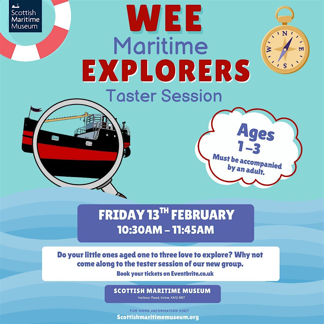 Welcome to the Wee Maritime Explorers - Taster session for families with children aged 1-3 years happening at Scottish Maritime Museum, Linthouse Building on February 13, 2026 at 10:30 AM Come aboard for a fun-filled morning of maritime adventures, family play activities and a chance to explore the Museum together. You will also have opportunity to let us know how you think the sessions should continue.