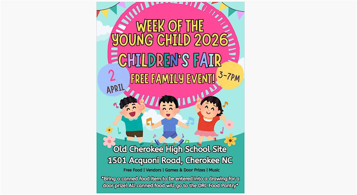 Join us at Cherokee High School to celebrate the Week of the Young Child! It’s a great chance to have fun, learn, and connect with others in the community. There will be free food, vendors, music, games and door prizes.