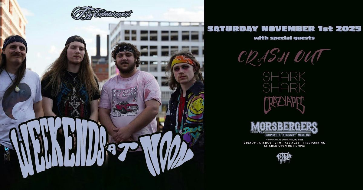 Come hang out with us at Morsberger's Tavern with WEEKENDS AT NOON for some awesome live music! We also have three amazing bands lined up for you - Crash Out, Shark Shark, and Crazy Apes. Get ready to rock out and have a great time with friends. Brinhg a Friends. This is a all ages show.