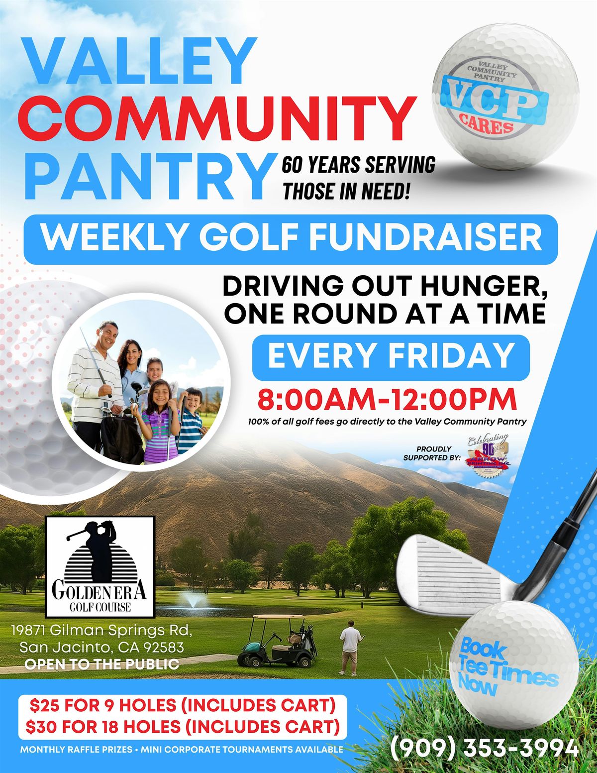 Join us every Friday at Golden Era Golf Course for our weekly golf rounds supporting the Valley Community Pantry! We’re driving out hunger, one swing at a time.