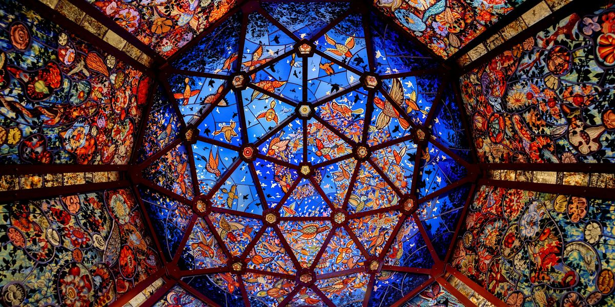 Detail shots of "Super/Natural," stained glass dome structure. Glass designed and fabricated by Judith Schaechter (studio assistant, Konstantin Sievaplesov). Dome designed by Judith Schaechter and Patrick Murray, fabricated by Patrick Murray and Kyrue Walker.