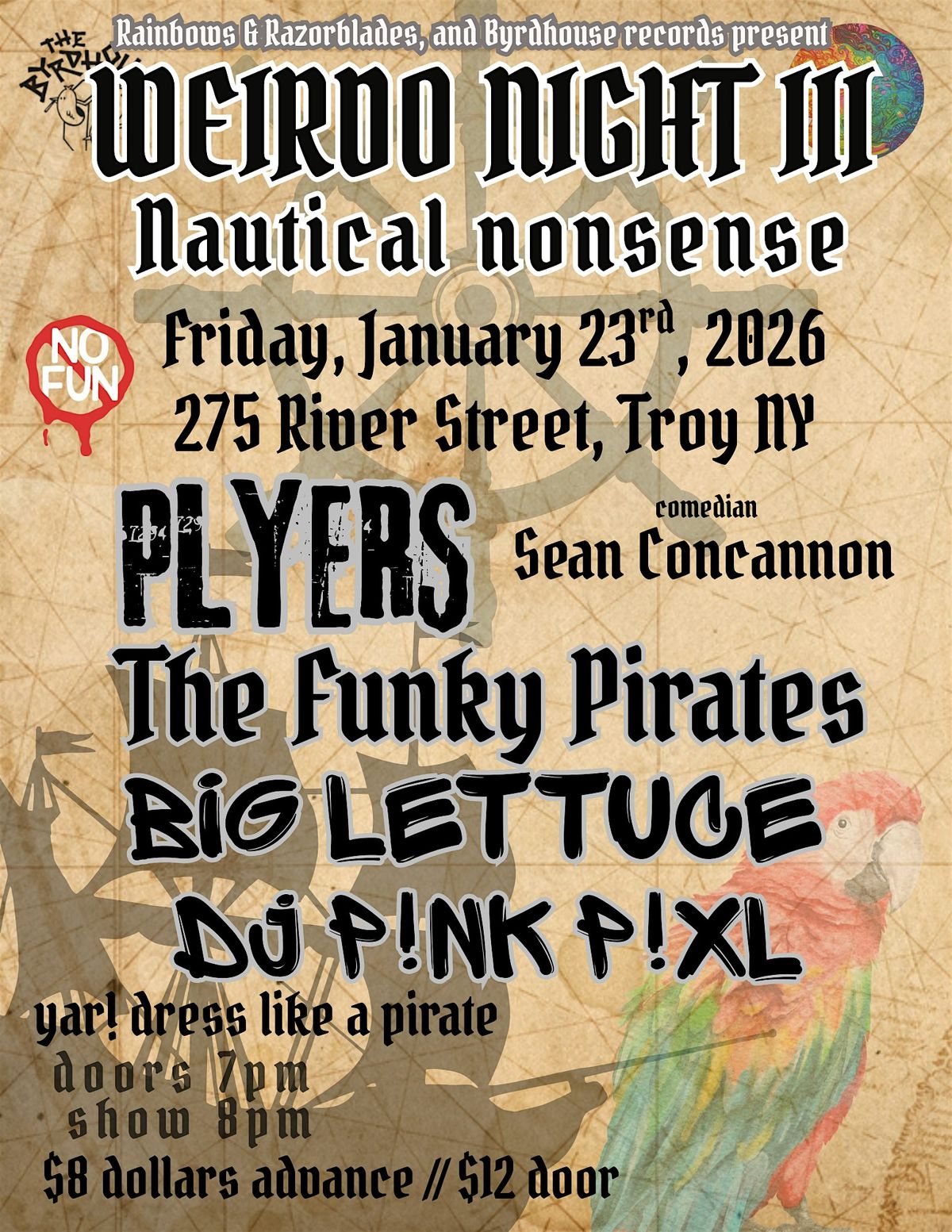Wear a pirate or similar costume for theme! Prepare to get funky and be weird!