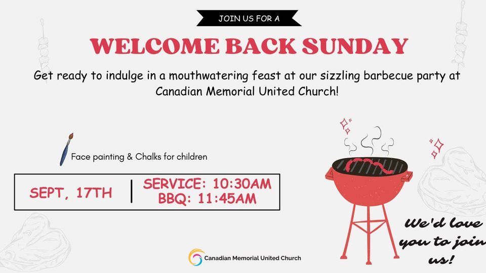As the warmth of summer fades and the leaves start to turn, the anticipation of fall brings a renewed sense of community and connection. We are thrilled to invite you to our much-awaited Welcome Back Sunday on September 17, 2023, at Canadian Memorial United Church. This special day marks the beginning of our fall programs and offers a wonderful opportunity to come together as a community, celebrate, and create cherished memories with a special BBQ.Mark your calendars for September 17, 2023, and prepare for a day filled with laughter, fellowship, and the joy of being part of the Canadian Memorial United Church family. We can't wait to welcome you back and embark on this exciting journey together. See you at the Welcome Back Sunday!