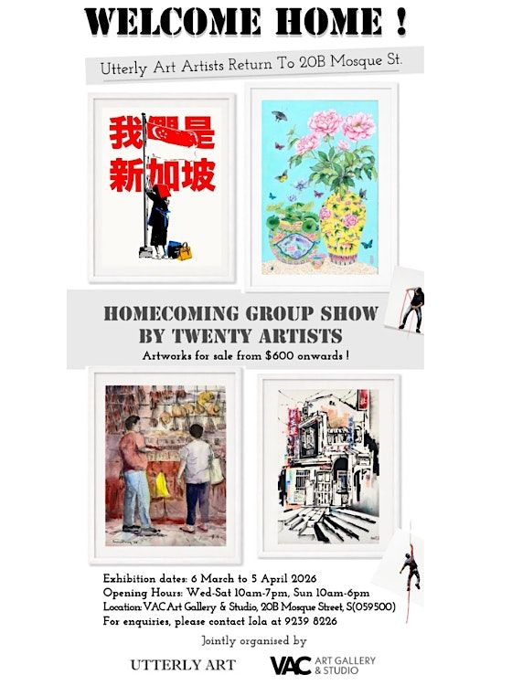 Welcome Home! – Utterly Art Artists Return to 20B Mosque Street marks the opening of a new chapter for artists, audiences, and the arts community within Singapore’s historic Chinatown district. Set in the newly established VAC Home for the Arts at 20B Mosque Street, the exhibition brings together artists whose practices reflect ideas of return, belonging, memory, and place.