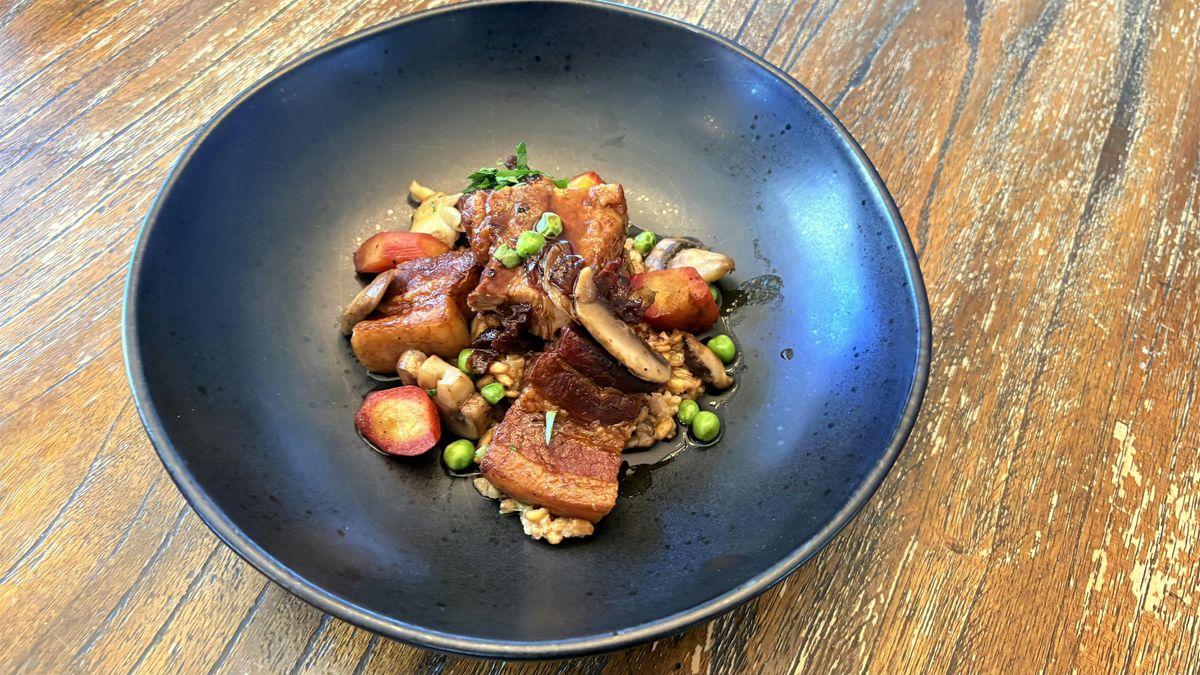 cherry glazed pork belly with carmelized carrots, farro and peas
