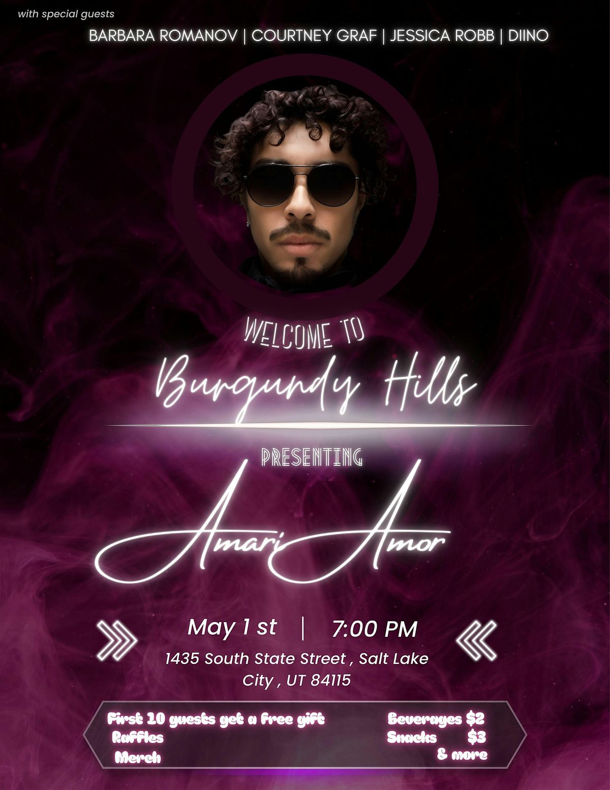 Raffles, Music, Merch & More! Welcome To Burgundy Hills is the first ever headliner for Amari Amor, commemorating his debut mixtape release, BURGUNDY HILLS. It will feature special guests, local vendors, snacks, beverages, raffles, merch tables, live music and a community experience for those local to the Salt Lake City area! Can't wait to see you all there!