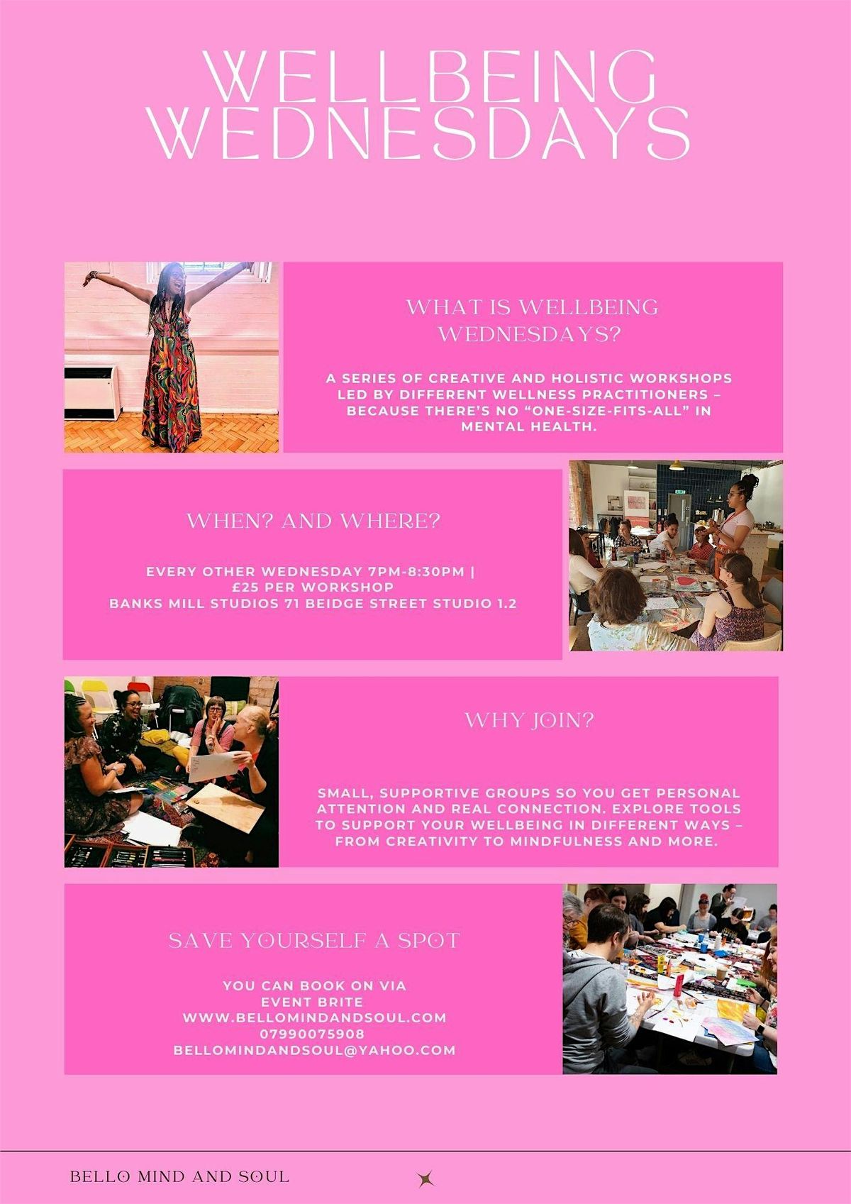 Welcome to Wellbeing Wednesdays! Join us at Banks Mill Studios every other Wednesday dedicated to your mental health and wellbeing. Take a break from the hustle and bustle of daily life to focus on self-care and relaxation. Let's come together to learn new ways to improve our wellbeing and enjoy a day of mindfulness activities from different practitioners every month.Don't miss this opportunity to prioritize yourself and connect with like-minded individuals. See you there!