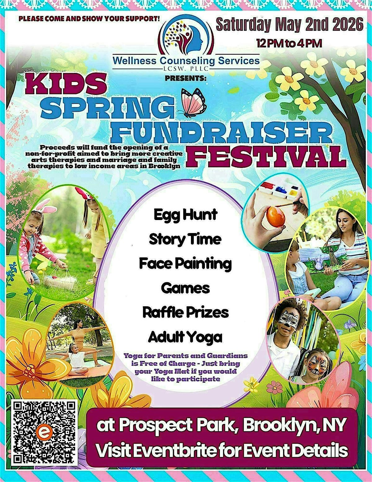 Welcome to the Wellness Counseling Services Kids Spring Fundraiser Event! Come together with the community to raise funds to open a non-for-profit to help bring more creative arts therapies and marriage and family therapies to low income areas in Brooklyn. Our goal is to collect 1,000 Donations through community outreach efforts to help support children and families through creative therapy styles and raise awareness for mental health in communities throughout Brooklyn. No Donation is too small! Join us for a day of fun and help support a great cause!