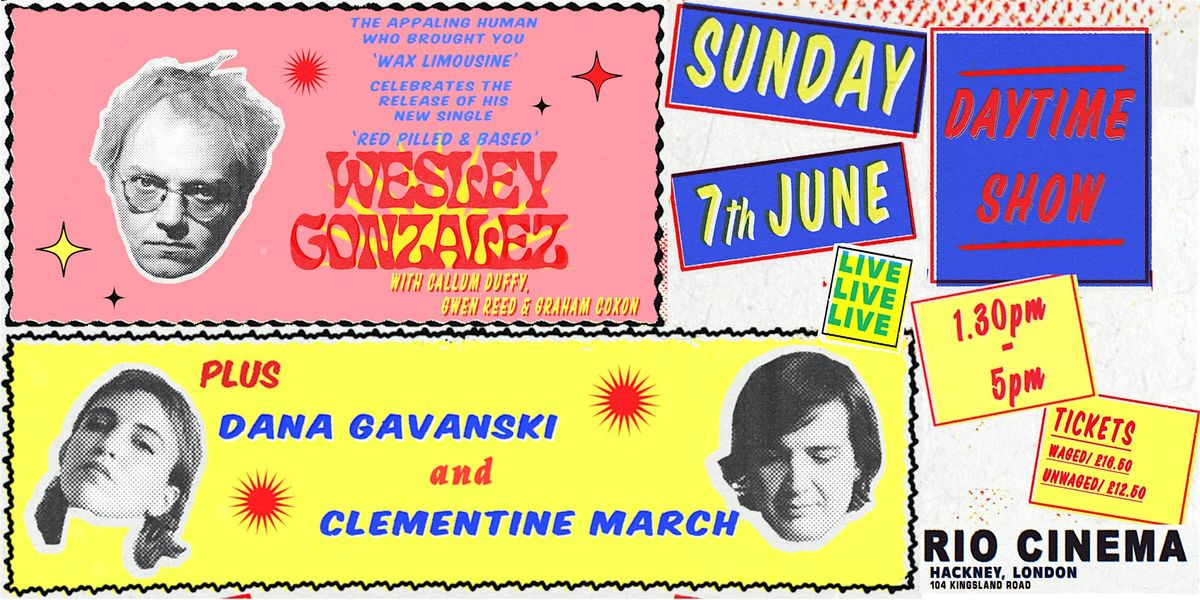 Wesley Gonzalez launches his new single 'Red Pilled and Based' at Dalston's Rio Cinema with a daytime performance of new material accompanied by Rose Elinor Dougall, Graham Coxon, Callum Duffy and Gwen Reed. also on the bill is Canadian singer-songwriter Dana Gavinski signed to Full Time Hobby Records, Dana will be playing with a small band working on new material and performing songs from her 3 acclaimed solo albums.French Singer Songwriter Clementine March rounds out the lineup who has just released their fantastic second album 'Powder Keg' on PRAH recordings.