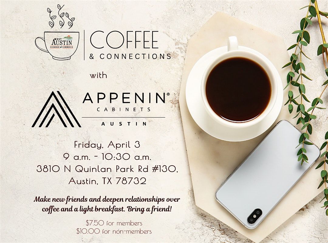 Join the West Austin Chamber for Coffee & Connections, hosted by Appenin Cabinets in Steiner Ranch. This monthly gathering brings together a high-quality mix of local professionals, business owners, and community leaders—all in a relaxed, welcoming environment.