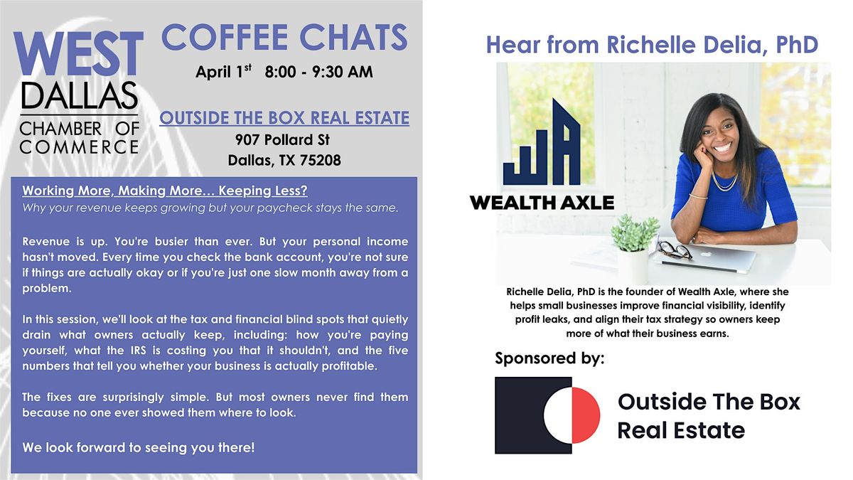 We hope you will join us for April's Coffee Chat with Richelle Delia, PhD. She is the founder of Wealth Axle, where she helps small businesses improve financial visibility, identify profit leaks, and align their tax strategy so owners keep more of what their business earns.