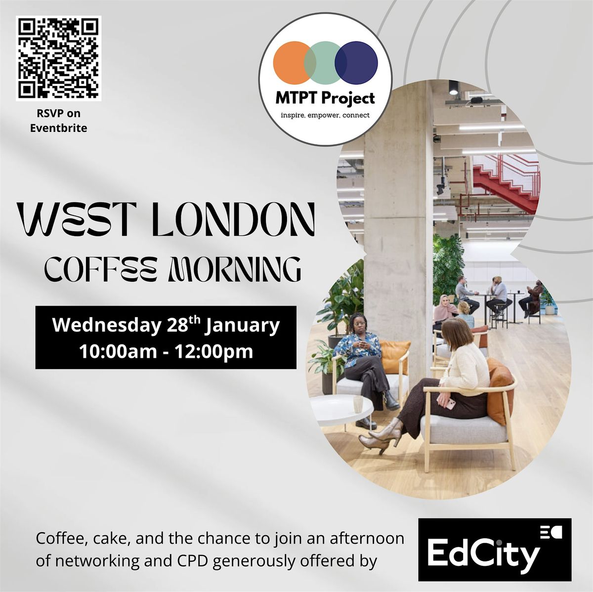 Come join The MTPT Project for a relaxed morning of coffee, cake and networking at Ed City (nearest tubes White City and Wood Lane) hosted by MTPT Founder, Emma Sheppard.