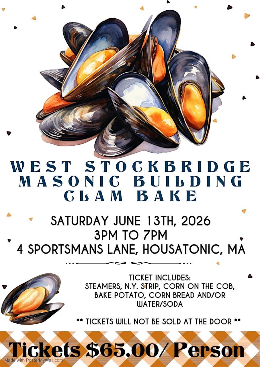 1st Annual West Stockbridge Masonic Building Clam Bake. Ticket includes steamers, N.Y. Strip Steak, Bake Potato, Corn on the Cob.About this Event
