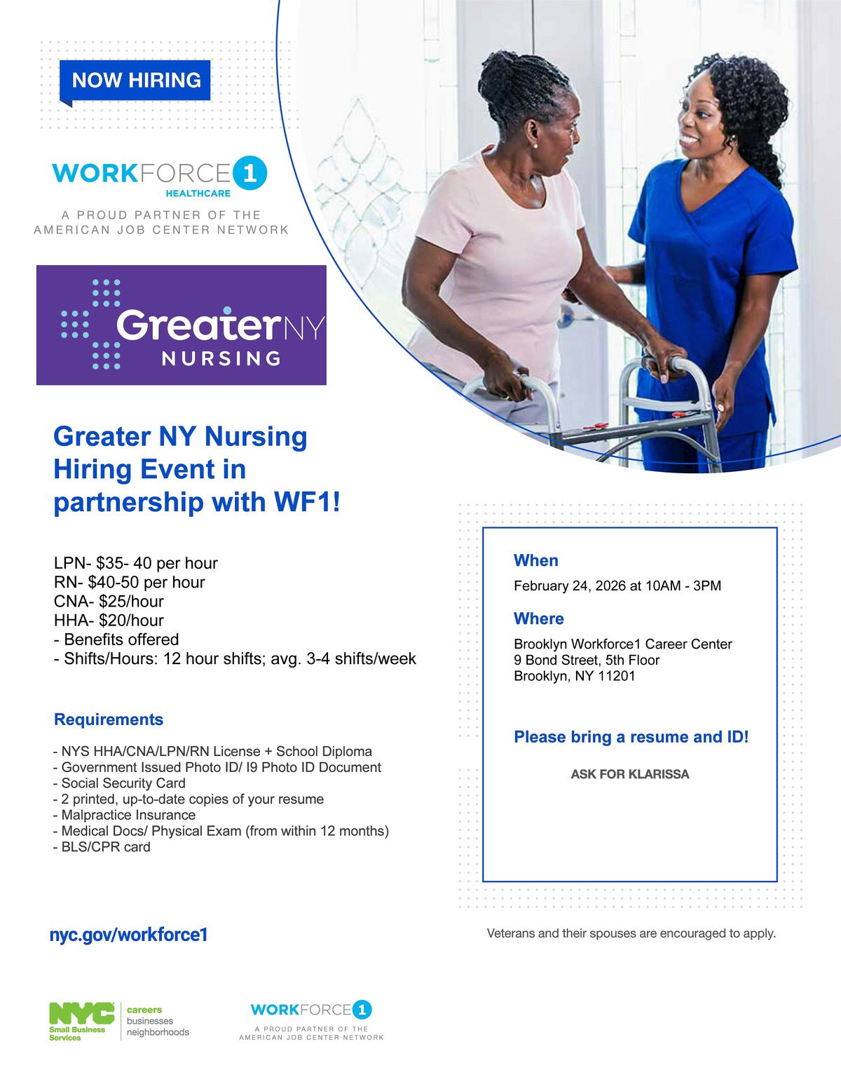 Join us at Brooklyn Workforce 1 for a hiring event with Greater New York Nursing Services on February 24th, 2026, from 10 AM - 3 PM. Bring your resume and ID! Ask for KLARISSA upon arrival!