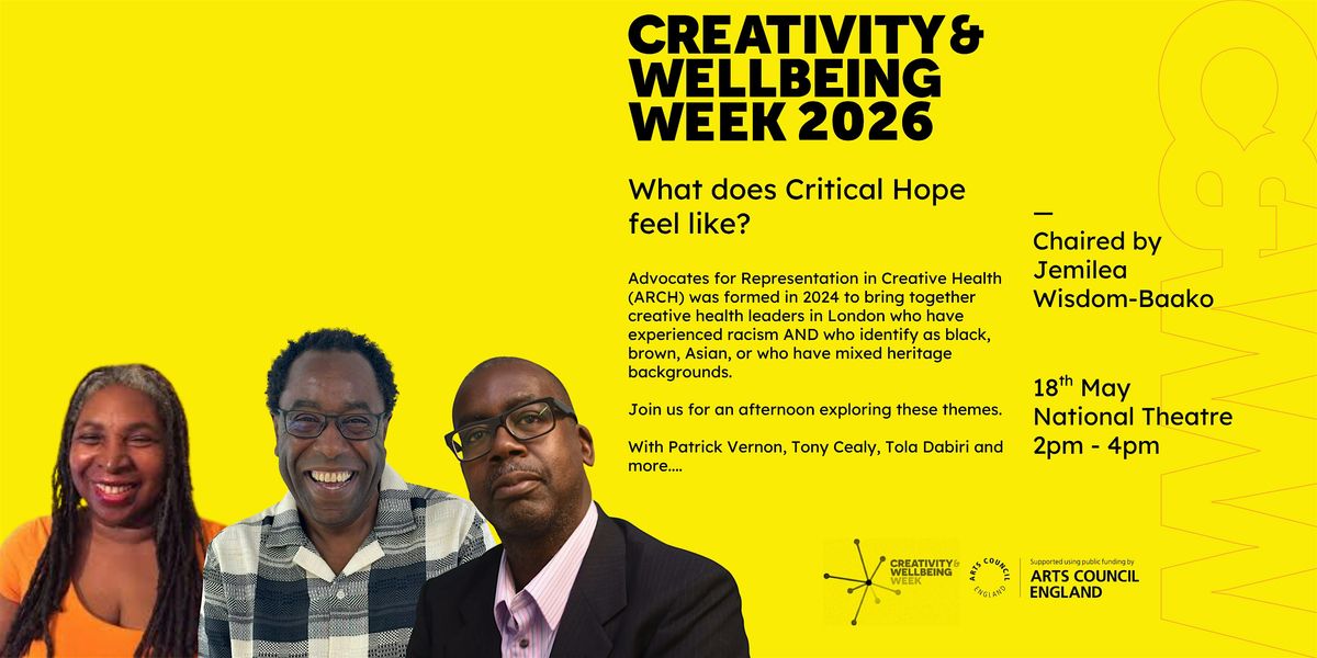 In the afternoon of day one of Creativity and Wellbeing Week we continue to explore our theme of Critical Hope for Acute Times with an original event curated by the Advocates for Representation in Creative Health. This year's theme acknowledges the increasing precarity in the health and care sectors including the impending NHS redundancies, ongoing instability in funding for Creative Health and the rising pressures linked to planetary health and climate change. Hear from cutting edge speakers, network and re-energise at this free event.