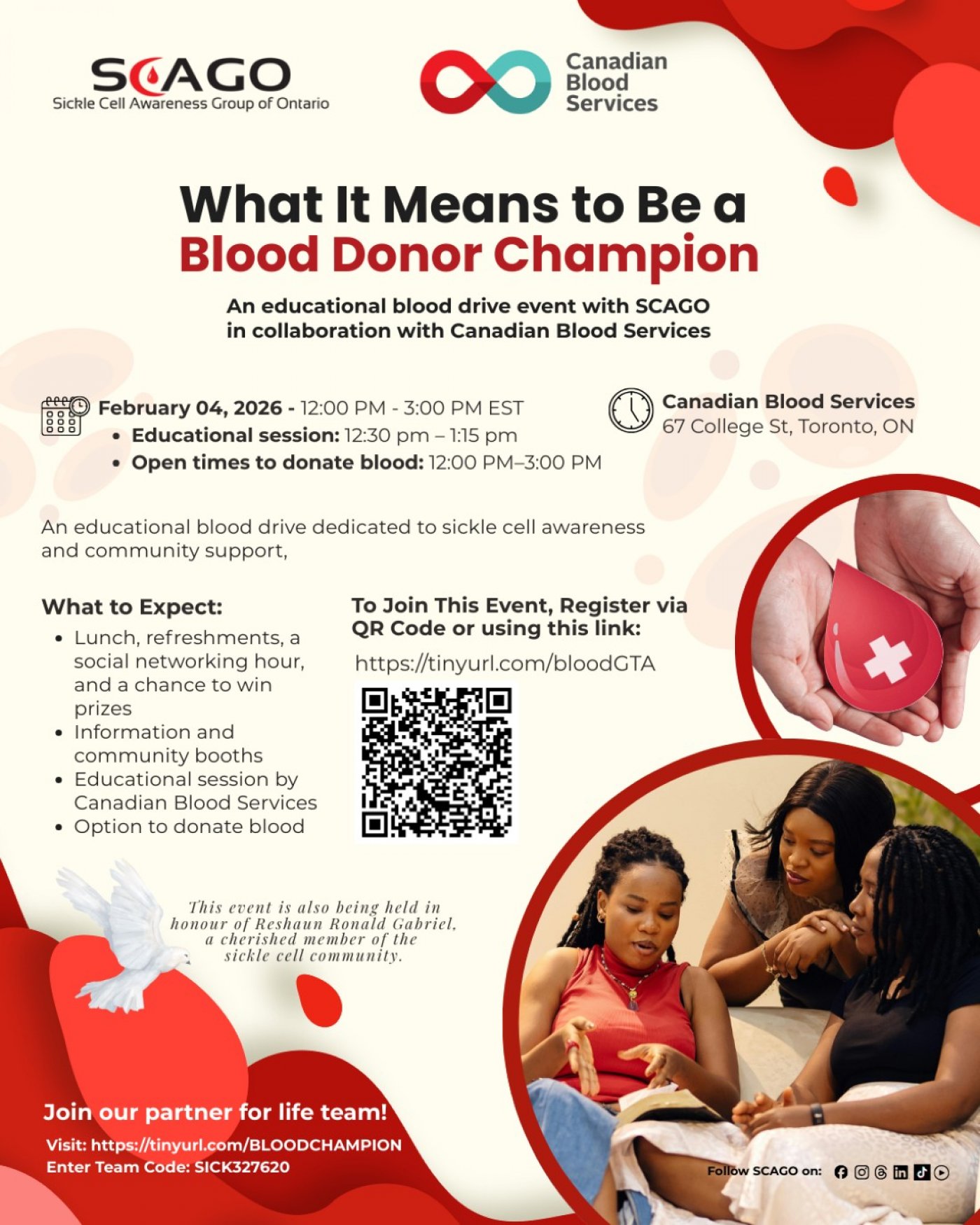 On February 4, 2026, the Sickle Cell Awareness Group of Ontario (SCAGO) will host a special Black History Month blood donation event in downtown Toronto.