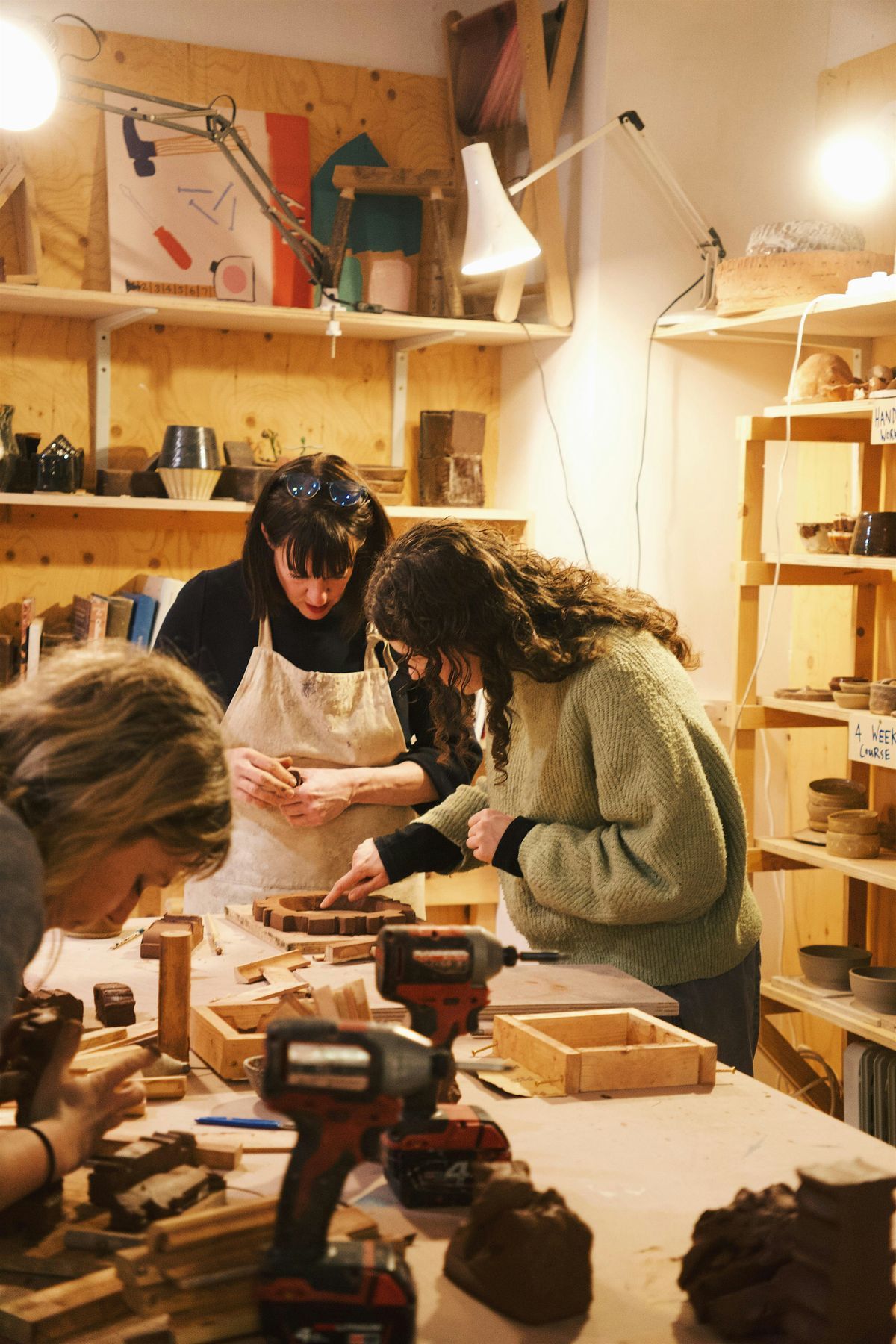 You'll come away with a small handful of finished objects: hand-carved wooden stamps, a ceramic vase, and a wooden box with ceramic elements.
