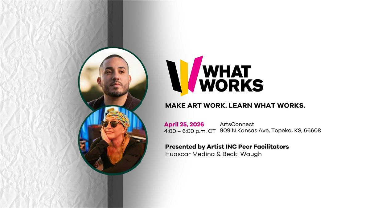 The workshop includes the What Works presentation, time for discussion with peer facilitators, and a panel conversation with Artist INC alumni. Information on applying for the Artist INC Topeka 2026 cohort will also be available.