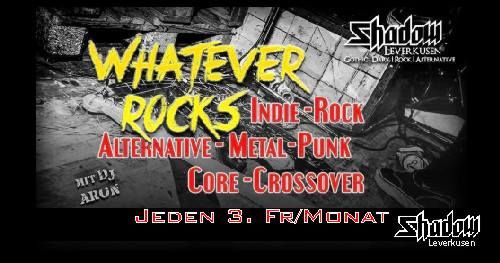Whatever Rocks mit DJ Aronmit Bands wie System of a Down, Korn, Rise Against, Linkin Park, Marilyn Manson, Disturbed, in Flames, Placebo, Rammstein, Callejon, Ramones, the hives, die Ärzte, Pendulum, Hollywood Undead, Turbonegro, Broilers, the Doors, Prodigy, Rob Zombie, Queens of the stone age, Heaven Shall Burn, Editors, Volbeat, Pantera, Slipknot, Red hot chili peppers, Billy Talent, Deftones, the Killers uvm.