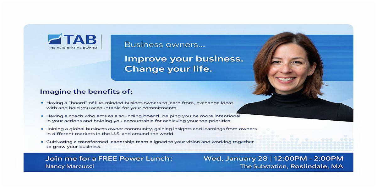 I am hosting an exclusive Power Lunch on Wednesday, January 28 from 12:30PM - 2:30PM at The Substation, 4228 Washington St, Roslindale, MA Join a select group of like-minded business owners/CEOS/Presidents from Greater Boston area to pool our collective knowledge and experiences, finding the best solutions for the challenges we face. We’re certain you’ll have valuable experiences to share, and you’ll have the opportunity to learn from others who have successfully overcome similar obstacles.