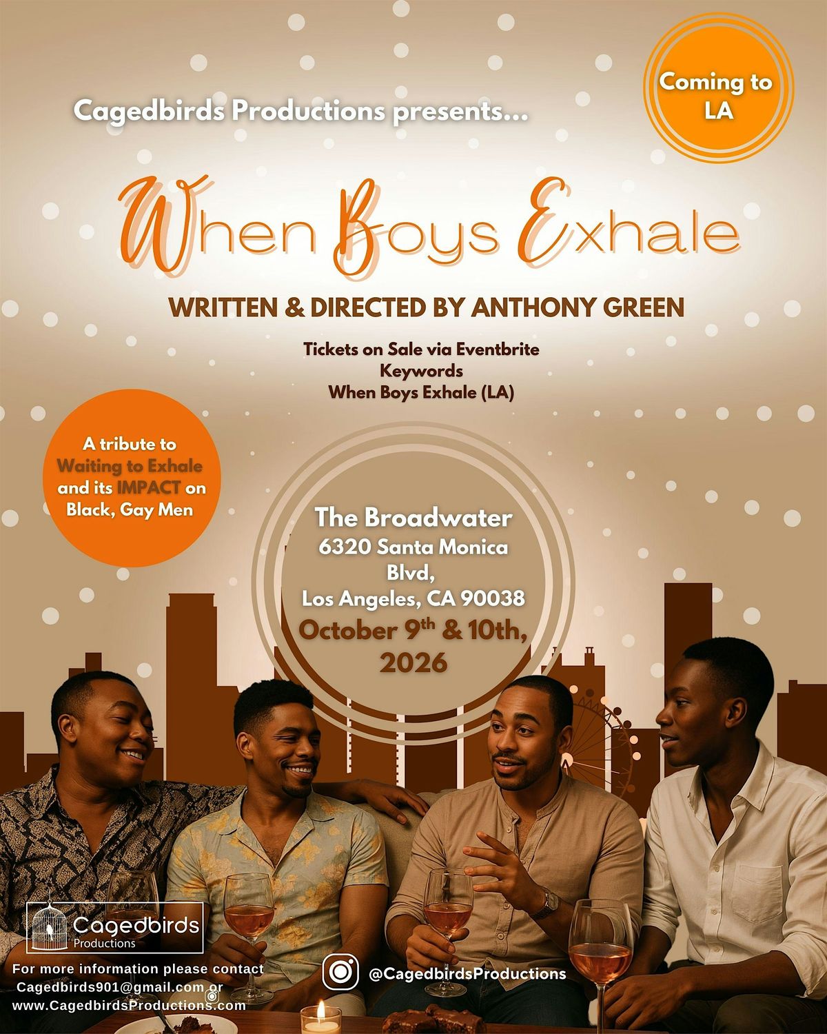 After successful shows in Nashville, Atlanta, Houston, Chicago and DC, 'When Boys Exhale' comes to LA. This original, stage play is a tribute to 'Waiting to Exhale' and has been making audiences EXHALE since 2020. You don't want to miss this hilarious and thought-provoking celebration of black queer friendship .