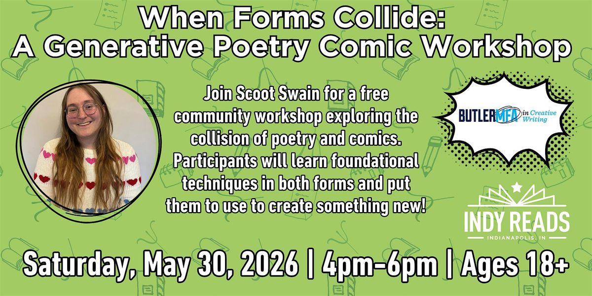 Indy Reads is excited to partner with Butler University's MFA Program to present When Forms Collide: A Generative Poetry Comic Workshop, hosted by Scoot Swain at Indy Reads community bookstore on Saturday, May 30, 2026, from 4–6pm.