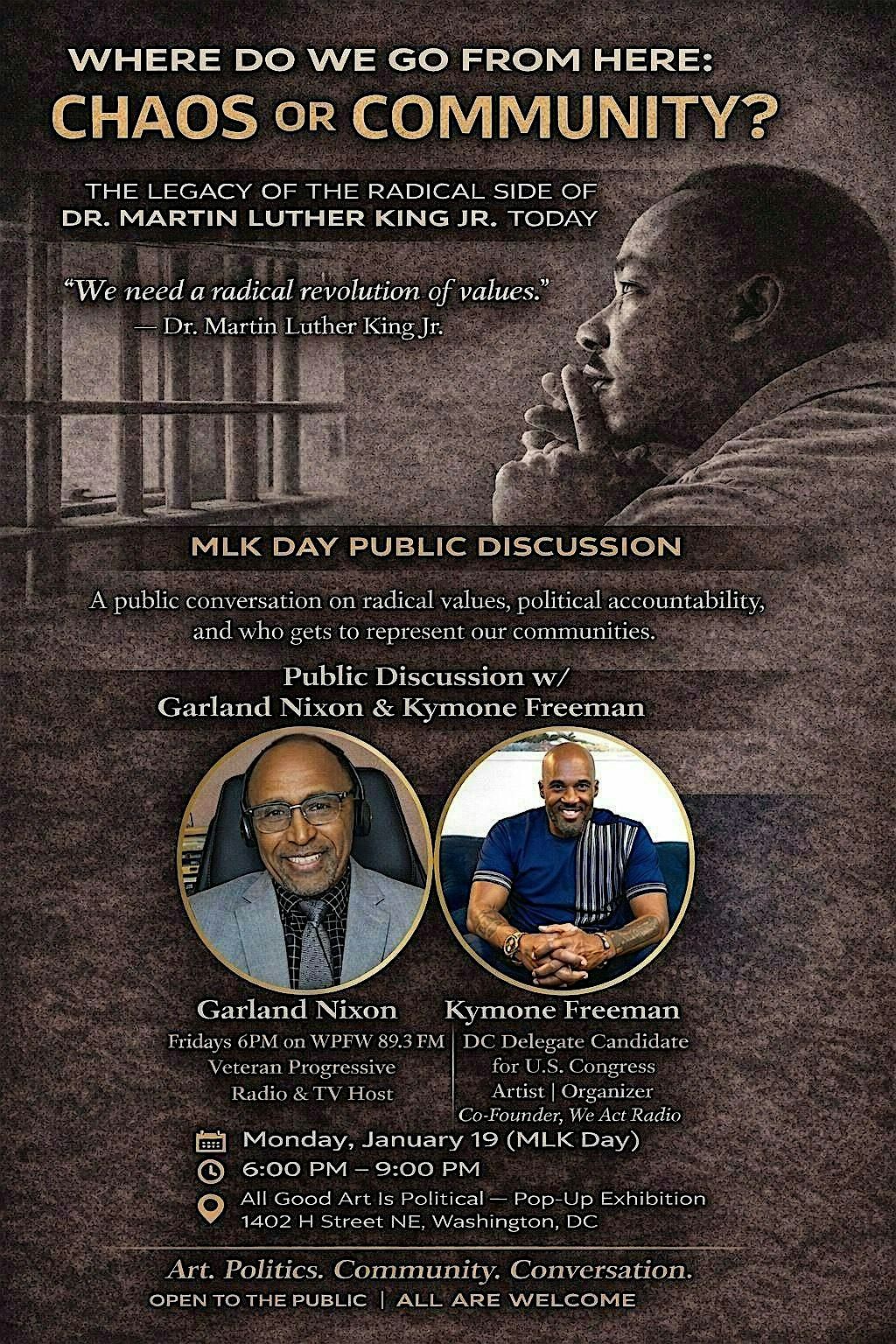 Join Garland Nixon, veteran progressive TV and radio host heard on the local Pacifica Network WPFW 89.3FM every Friday at 6pm, and Kymone Freeman of We Act Radio for a public conversation and dialogue on the radical values and the often overlooked political accountability of Dr. King’s legacy. They will excavate the radical legacy of King who has been buried under a mountain of praise as they focus on everything he stood for during the last two years of his life. This artistic, political, community conversation will feature original artwork from noteworthy DMV artists, Aniekan Udofia, Demont “Peekaso” Pinder and others.